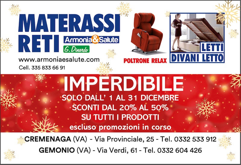 Il mese di dicembre porta una grande opportunità per chi desidera migliorare la qualità del riposo e rinnovare la casa. Nei negozi “Materassi Reti – Armonia & Salute” di Giuseppe Dinardo a Gemonio e Cremenaga è attiva una promozione dal primo al 31 dicembre, con sconti dal 20% al 50% su numerosi prodotti dedicati al benessere, ad eccezione delle offerte già in corso.