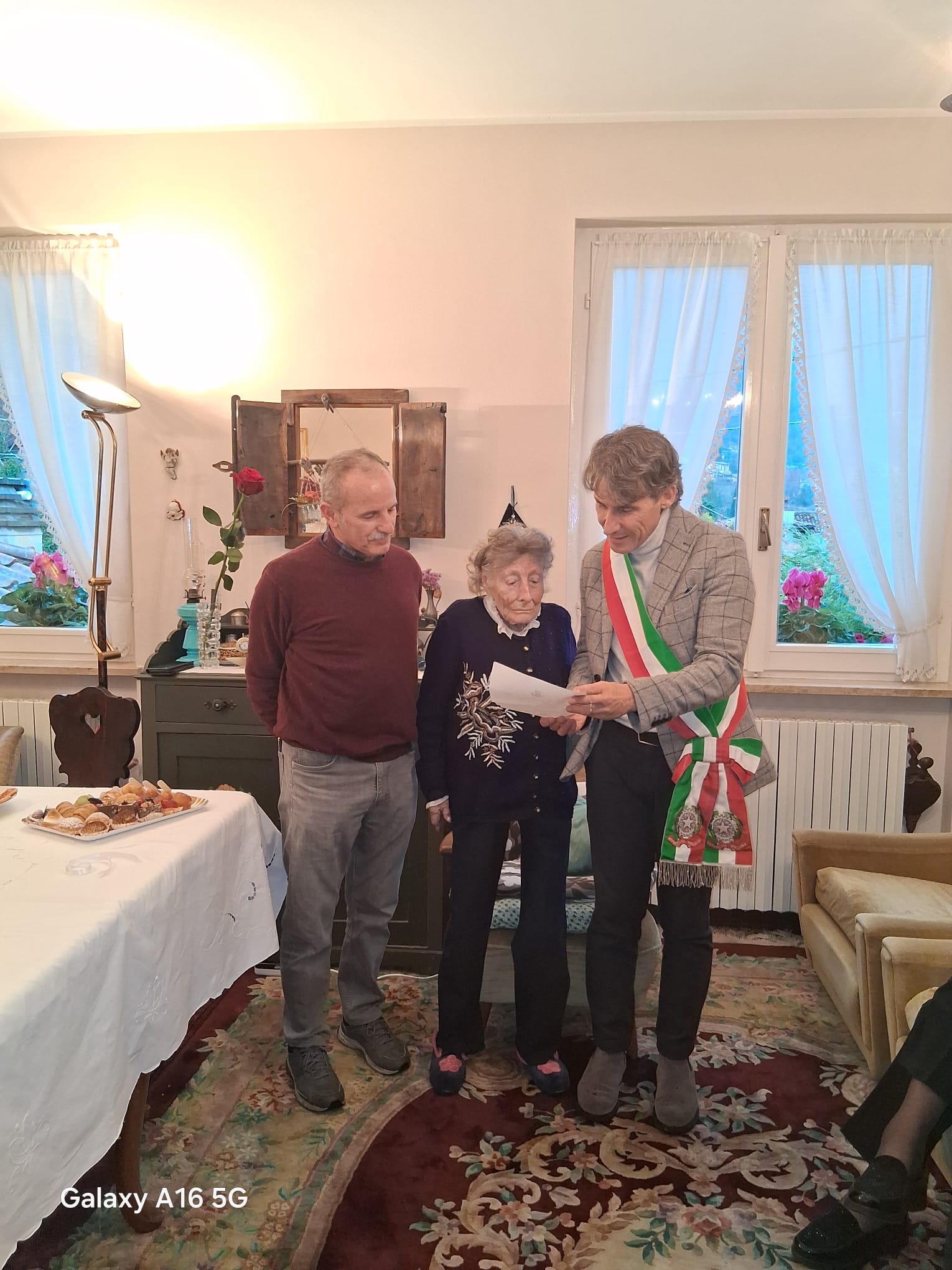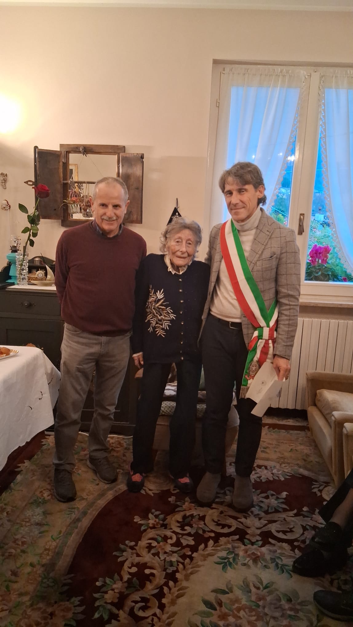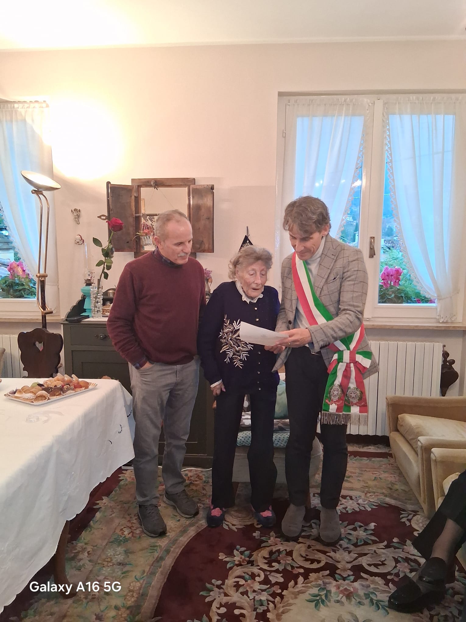 A portare personalmente gli auguri dell’amministrazione comunale è stato il sindaco Maurizio Spozio, accompagnato dal consigliere comunale Giuliano Cometti. Il primo cittadino ha consegnato alla signora Bagattini un riconoscimento ufficiale come omaggio a “una vita straordinaria, esempio luminoso di dedizione e amore”, sottolineando il valore umano e sociale di una donna che rappresenta una vera memoria vivente di Castelveccana.