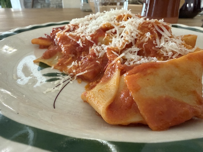 Il cavallo di battaglia tra i primi piatti sono le pappardelle ai 12 tuorli tagliate al coltello, preparate con uova fresche biologiche e condite con ragù di cinghiale proveniente da caccia di selezione, lavorato dall’Azienda Agricola Il Quadrifoglio. La pasta ha consistenza e carattere, il condimento è intenso ma equilibrato. In quel momento si comprende quanto la tecnica e la memoria possano convivere nello stesso piatto.
