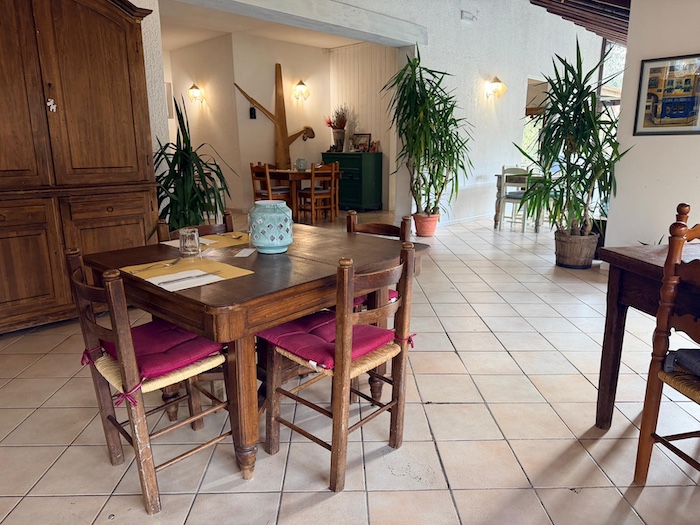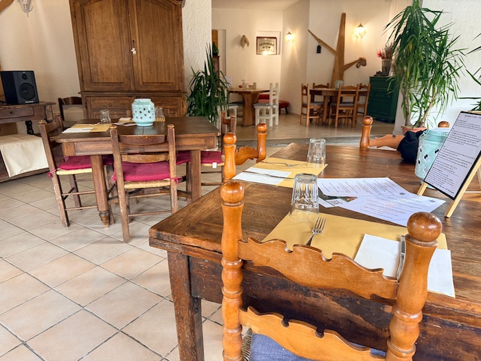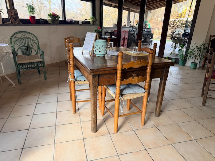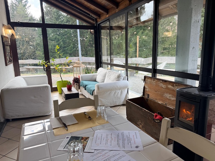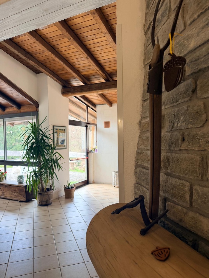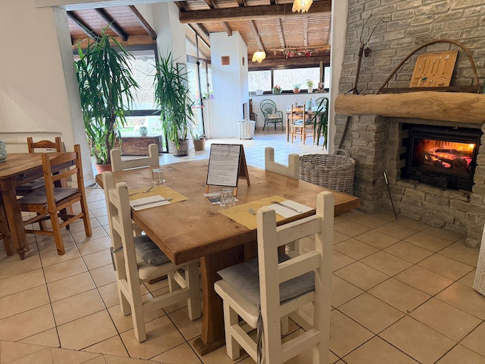 Il caminetto acceso, le travi in legno, i tavoli in stile rustico e la luce che filtra dalle vetrate affacciate sul verde costruiscono un’atmosfera calda, intima. Ci si accomoda e in pochi minuti la sensazione è quella di essere a casa di qualcuno che ama ricevere ospiti. Non c’è fretta, non c’è formalità forzata, ma un equilibrio tra cura e semplicità.