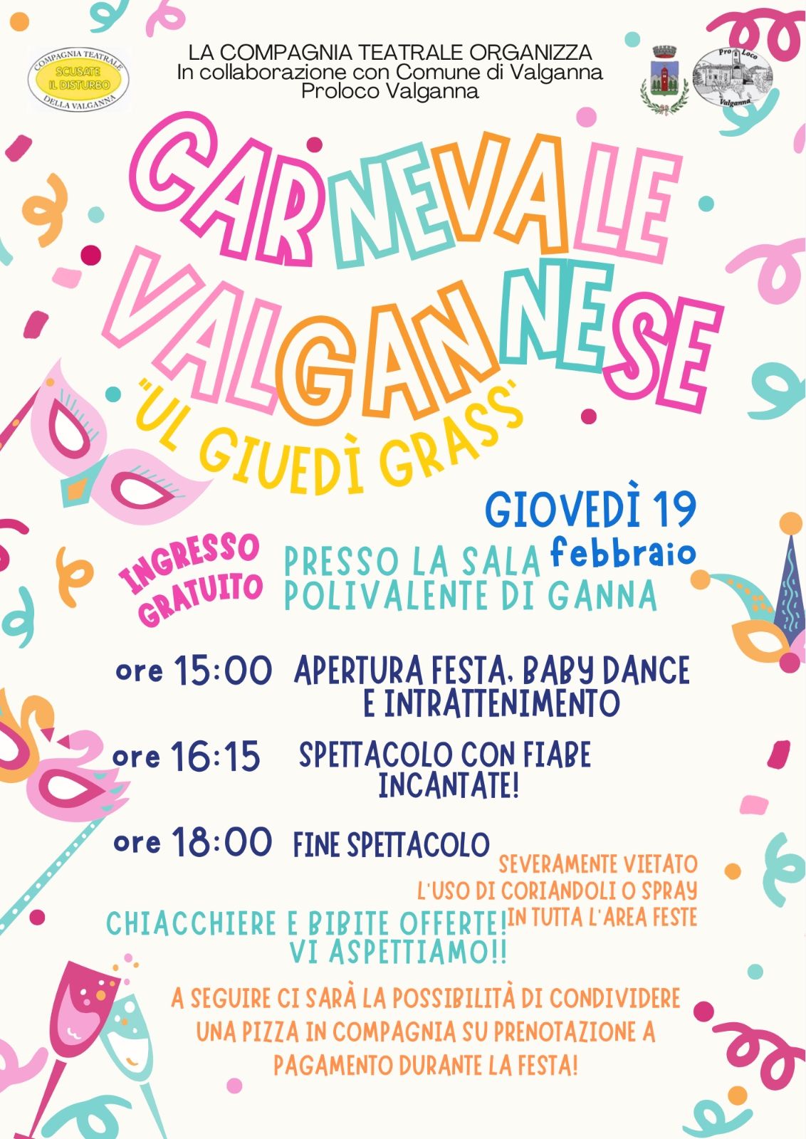 Sarà un pomeriggio di allegria e tradizione quello in programma giovedì 19 febbraio a Ganna, dove la sala polivalente ospiterà il Carnevale Valgannese in occasione del “giuedì grass”. Un appuntamento pensato per grandi e piccoli, nel segno della convivialità e della voglia di stare insieme, organizzato dalla compagnia teatrale Scusate il Disturbo in collaborazione con il Comune e la Pro loco di Valganna.