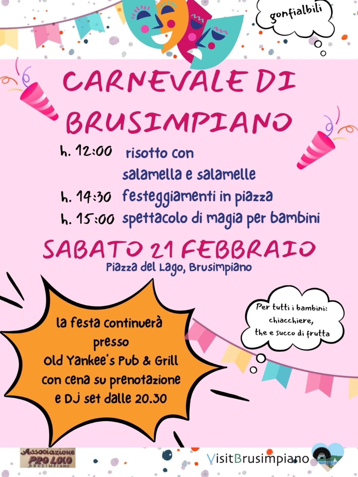 Durante la manifestazione saranno offerte chiacchiere, tè e succo di frutta per i più piccoli, contribuendo a rendere ancora più dolce e accogliente l’atmosfera della giornata. Il Carnevale di Brusimpiano proseguirà anche nel pomeriggio e in serata: tutti i dettagli sul programma completo sono disponibili nella locandina dell’evento.