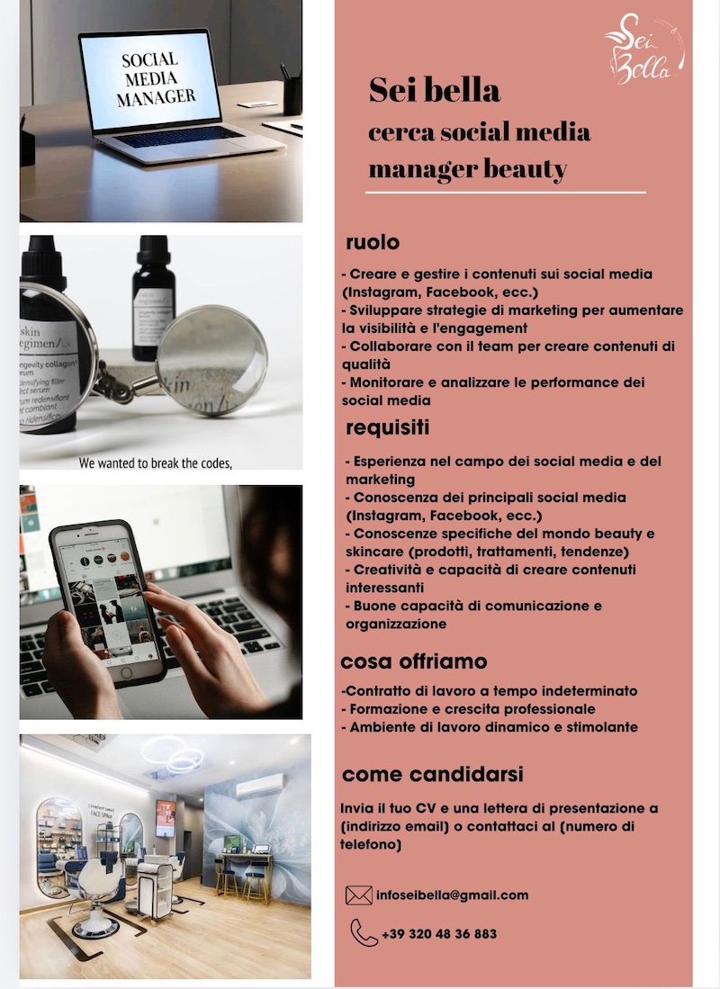 Per quanto riguarda il ruolo di social media manager, la figura selezionata si occuperà di creare e gestire contenuti sui principali social network, tra cui Instagram e Facebook, sviluppando strategie mirate ad aumentare visibilità ed engagement. È richiesta esperienza nel campo del marketing digitale, conoscenza delle piattaforme social e competenze specifiche nel settore beauty e skincare, con attenzione a prodotti, trattamenti e tendenze. Tra le mansioni previste anche il monitoraggio e l’analisi delle performance online, oltre alla collaborazione con il team per la produzione di contenuti di qualità.