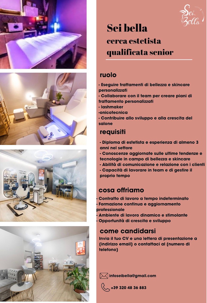 Le candidature possono essere inviate tramite curriculum vitae e lettera di presentazione all’indirizzo mail infoseibella@gmail.com oppure contattando il numero +39 320 48 36 883. L’annuncio è rivolto a professionisti del settore interessati a entrare in un contesto dedicato alla cura della persona e alla comunicazione nel mondo beauty.
